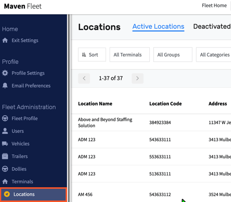 Use search and filters (name, code, terminal, group, category, tags, address) to locate the location.
