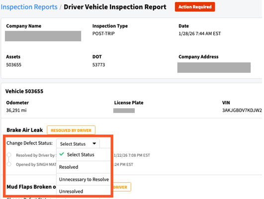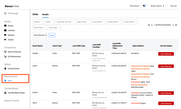 Review driver vehicle inspection reports and track defect status under Maintenance.
