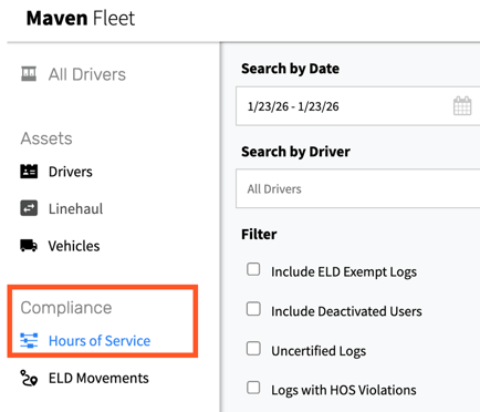 Navigate HOS data and controls through the Compliance menu