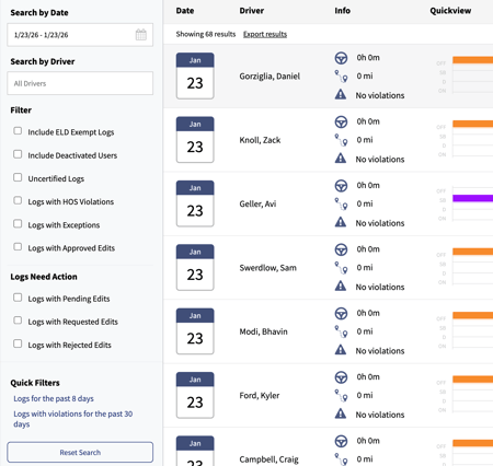 Filter by driver name/ID, terminal, duty status, violations, and certification status. |