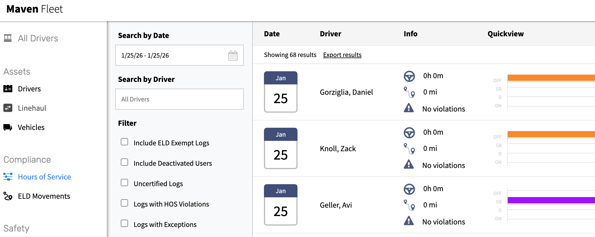 Shows a violation badge next to drivers with violations in the selected date range.