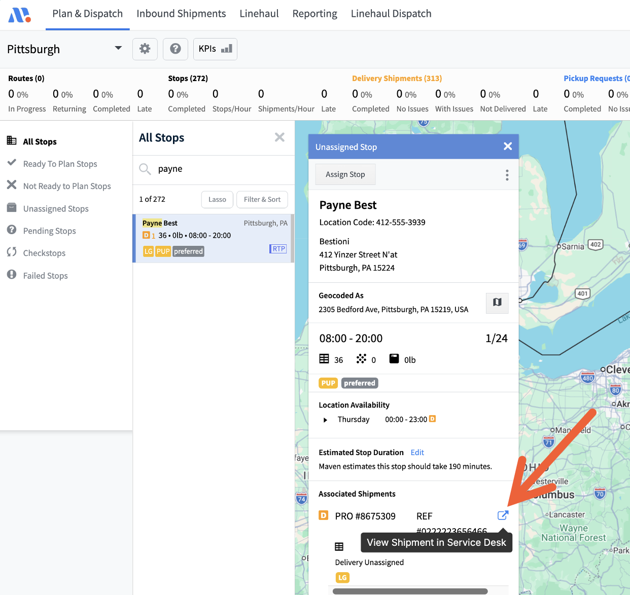 Scroll to Associated Shipments in the stop details.